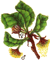 An Stielen hängen die männlichen, gelb-rötlichen Blüten. Sie sind von kugeliger Form. Die weiblichen stehen zu zweit in den Achseln von Laubblättern. Blütezeit ist von April bis Mai.